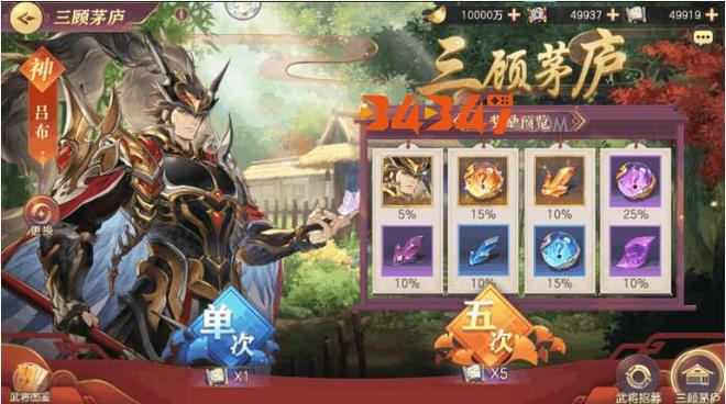 三顾茅庐:三顾茅庐中首先要大家选择心仪的武将,之后的抽卡如果抽中神将则必是大家的心仪武将,但是在三顾茅庐中没抽到神将前只能获得将魂和道具,无法抽到名将和良将,如果大家不在意的话,还是很值得抽的。