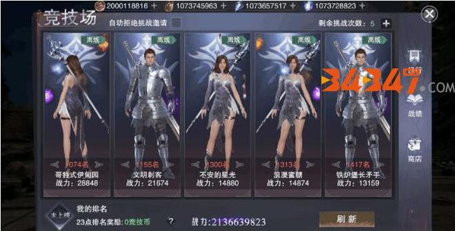在竞技场的界面中,大家能够看到五个与自己排名相差不大的玩家以及他们的战力值。大家可以选择对手进行挑战,获胜则可以取代他的排名,同时获得竞技币奖励,并且刷新对手供大家挑战更高的名次。每人每天有五次挑战的机会,最终获得的排名越高,奖励就越丰富。