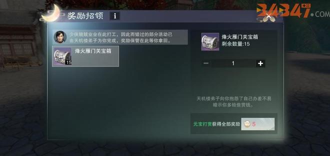 天机楼弟子会帮助玩家保留错过的日常活动的奖励,玩家拿回这些奖励需要对天机楼弟子进行打赏,通过打赏金钱或者打赏元宝领回保留的宝箱奖励。小伙伴注意,宝箱奖励有储存上限,系统最多保存5天的宝箱量。
