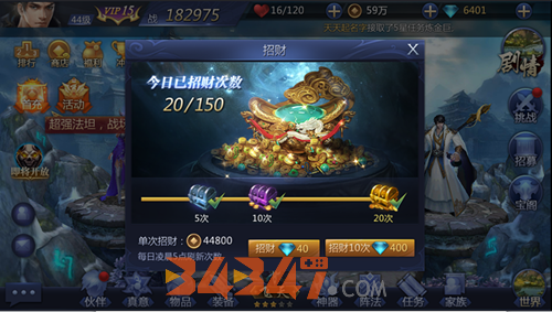 方法一:对于氪金的玩家,可以进行每日招财,位置在金币旁边的“+”号,用神晶来进行招财,这样是金币获得最快速的办法,但是玩家们一定要注意每天只可以进行150次。