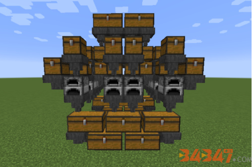 接下来我们要做的就是在最上面的连个箱子当中添加足够的燃料和生肉,他们就会自动通过漏斗进入熔炉,成熟之后又会通过漏斗进入最下面的箱子,这样一来相当于为熔炉的燃料槽和食物槽扩充了空间,我们只需要在箱子里装满材料,就可以很长一段时间不需要重复添加材料。