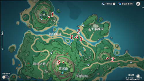 10、接下来我们要去寻找这3个雷灵,它们的位置其实在壁画中已经给出了答案——就是壁画上所画的这三座山的星星标记处,位置总览图如下,分开在三座山的1、2、3标表示雷灵的起点,聚在一起的是雷灵的终点: