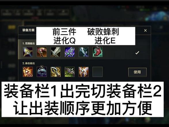 3、出装方面,先做暴风之剑,掠魂节杖(小吸血),长剑,此时进化q技能。然后小吸血合成破败王者之刃,出蜂刺进化e技能。之后蜂刺合成烈阳魔刃,暴风之剑合成无尽之刃,这样核心三件套做好,进入强势期。(这里也可以根据自己喜好将蜂刺换成反曲弓,烈阳魔刃换成卢安娜的飓风,打大团强一点点,单挑弱不少)此后,长剑合成复活甲,最后补一个赛瑞尔达的怨恨或凡性的提醒。(看对面回血多不多自己选择,如果对面回血很强比如有奶妈就做重伤弓而非冰刀,并且三件套后先出制裁小件防止回血)