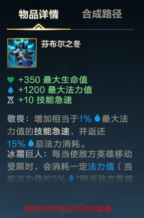 如果你打算出冬之降临,请将这件装备作为第一个大件,至少在第一次回家后先出女神之泪,方便你尽早堆叠被动层数。