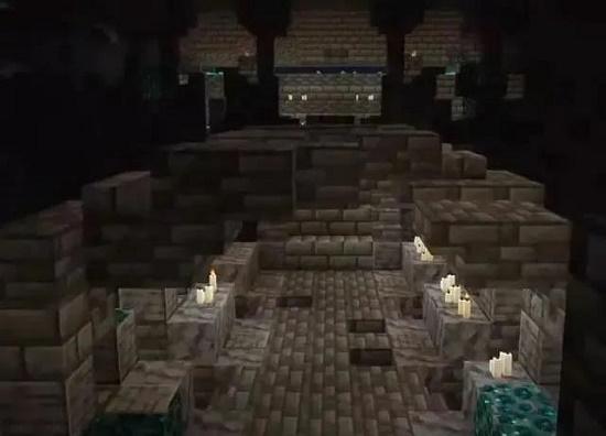 这个原版洞穴“地下城”结构的确是亮度低,好在有蜡烛、灵魂火、灵魂灯笼等照明方块,否则玩家们的眼睛都要看坏了,开宝箱可得雪球,用于分散Warden注意力。