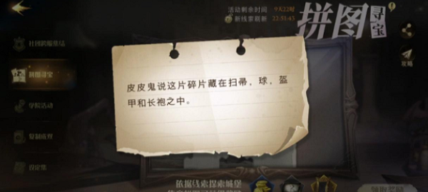 1、拼图信息:皮皮鬼说这片碎片藏在扫帚,球,盔甲和长袍之中。