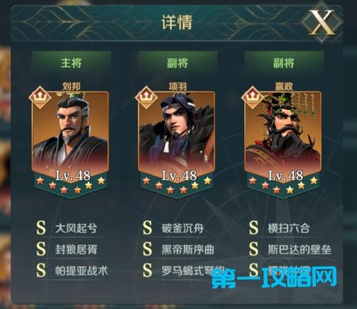 2.【秦失其鹿】:刘邦与项羽、嬴政同队,将激活【秦失其鹿】增益,战斗中我方主将获得2%的增伤,副将获得2%的减伤。