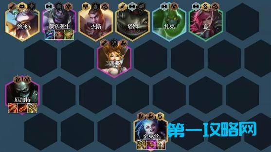 蔚、扎克、厄加特、迦娜、蒙多、厄加特、金克斯、塔姆、猫咪、杰斯(9人口大成阵容)
