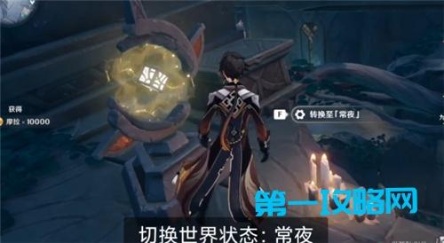 1.我们先用日月轮回机关将地图切换为白夜状态,之后再传送到狭间之街,飞到下图所示的位置。