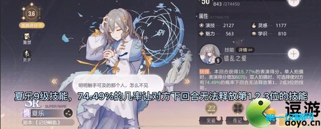 1.夏乐9级技能:抉择:额外获得表演分6070或者74.49%的几率让对方下一回合无法使用技能第一/第二/第三位的技能。