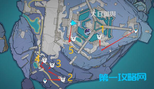 1.标点1:首先切换至常夜,传送至大日御舆右侧传送点,向图中位置飞去,到达后点燃两个火炬后开门,触摸蓝色机关,即可进入标点1。