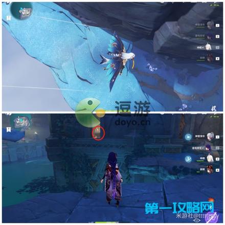 3.标点4:传送回左侧传送点,向右后方跳下,滑翔至下图入口处,路过两朵骗骗花,上个楼梯,湖对面间隙里就是标点4。