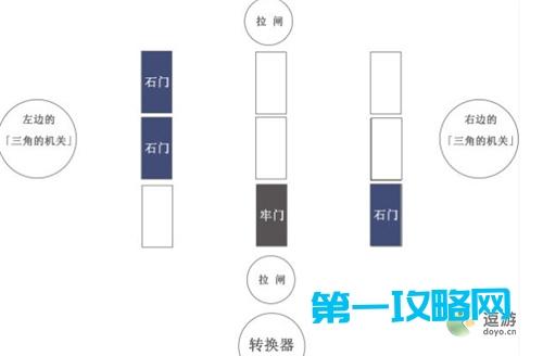 2.解密步骤二:启动一次靠近转换器的拉闸,启动一次另一个较远的拉闸,攻击一次左边的三角机关。等石门停止后,再攻击一次左边的三角机关。调整后的机关位置如下图所示。