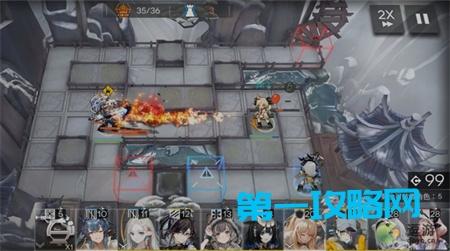 2.我们开局先在左侧岔路口部署干员【山】,携带二技能,然后在右侧高台部署干员【小火龙】,注意茶壶寄居蟹的分裂怪必须要法伤/真实伤害解决,由于本关地形元素,小火龙毫无疑问是最合适干员。