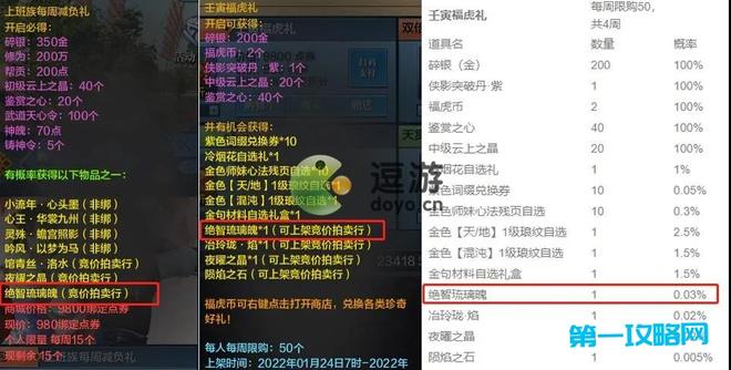 1.礼包:各类限时限购的礼包都有概率可以开出绝智琉璃魄,并可上架拍卖行。端游礼包概率如下所示比较低,不过考虑到端游点券获取方式较为简单,届时手游礼包的概率应该能高一些,不过基本也不会过1%。