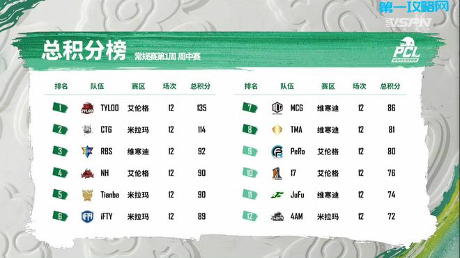 经过休赛期的调整与锻炼,各支战队都以全新的姿态站在了春季赛的舞台。由于本次春季赛重新采用积分赛制,各支战队都在全力展现自己的实力。在首周的周中赛中,TYLOO战队凭借第三天单日81分的精彩表现,以总积分135分排在首位晋级周决赛。CTG战队的LuckyWss选手手感火热,帮助队伍拿到114分,位列第二。在休赛期接连引援的RBS战队焕然一新,队内四人火力全开,以92分排在第三。NH、Tianba、iFTY和MCG等传统豪强也都悉数晋级。