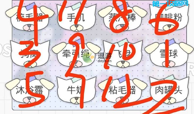 1、爱与陪伴顺序:1→雪球,2→肉罐头,3→狗窝,4→梳毛器,5→沐浴露,6→咖啡粉,7→牛奶,8→蒸汽棒,9→牵引绳,10→飞盘,11→手机,12→粘毛器