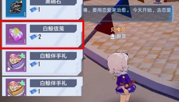 找到兑换员恩菲之后,打开旁边的商店就可以看到白鲸信笺礼盒,花费两个游玩卷,兑换白鲸礼盒,白鲸礼盒中会随机获得玫瑰信笺。