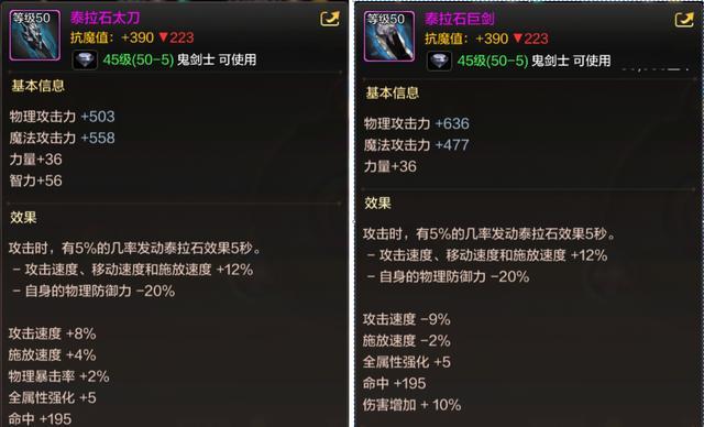 巨剑:基础物理攻击较高,装备带有力量加成,缺点攻击速低。