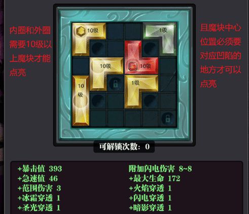 4.上锁凹陷处对应法盘的内圈外圈,必须放置至少10级的魔块且魔块中心位置对应凹陷处才会有宝石。