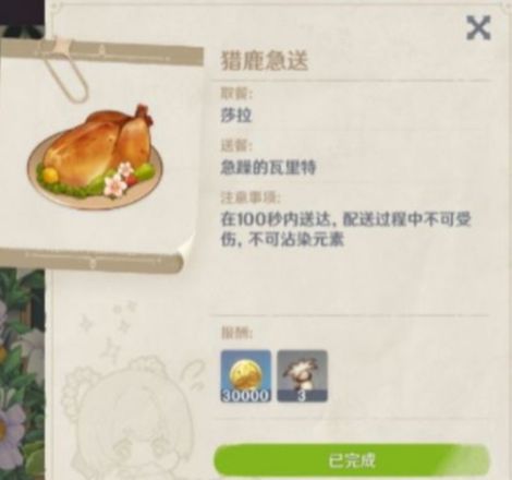 所谓的佳肴尚温,其实就是跑腿送外卖的。不过这个跑腿可不像是日常外卖订单任务那么简单,这个活动要求你外卖途中全程不能受伤,全程不能被元素沾染。