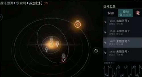 第三步:可以看到这是当前星系图,右边显示的是扫描出的未知信号,点击未知信号会在星图上显示他所在的位置。注意是不能跃迁过去的,因为它现在还是未知的信号,无法跃迁。