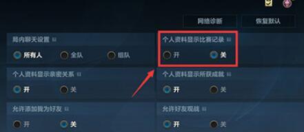进入综合选项,可以看到个人资料显示比赛记录,然后选择关,就可以把这个战绩显示给关闭了。