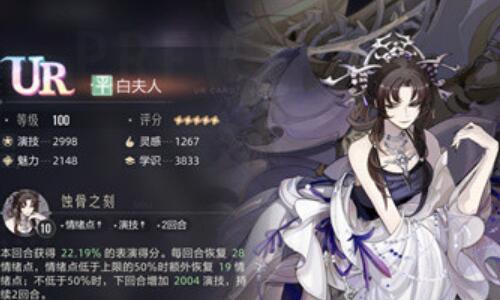 10级技能增加22.19%表演的分属于游戏目前的顶尖数值。技能一段回复28情绪点持续2回合。技能二段根据剩余情绪点的情况1额外回复19情绪点,持续两回合增加2004演技持续两回合。
