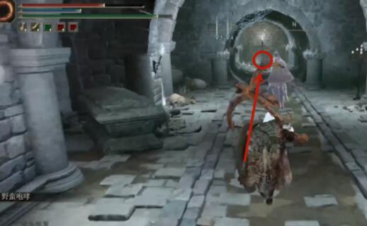 往前走一段路后,会看到龙虾,这个龙虾打人很疼,最好把血补满后翻滚过去,去下图所示的洞里。