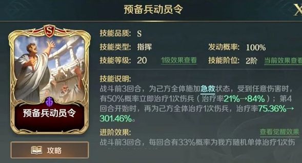 为我方全体施加急救3回合,第四回合再为全体治疗一次伤兵。作为治疗技能中的天花板,预备兵的治疗效果毋庸置疑,同时由于其为指挥技能,所以治疗非常稳定,配合伊莎贝拉的高智力属性,治疗基础量也有一定的保障。