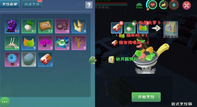 1、幼月狐饲料=仙灵萝卜+桂木叶+稀有肉,桂木叶是新岛的树掉落的叶子,使用以上材料即可制作出幼月狐的饲料
