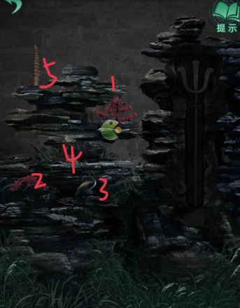 4.根据女主给的提示,到假山,依次点击:树、树、鹤、亭子、塔,得到三叉戟