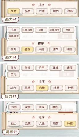 点击选择灵宠左下角,可以从战力、品质、六维、境界、种族五个方面选择出自己想要提升的主灵宠。