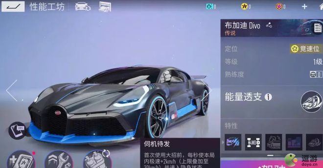 3、布加迪Divo在对局中首次使用大招前,每秒使本局极速+2km/h(上限叠加至30km/h)并进入隐身状态。