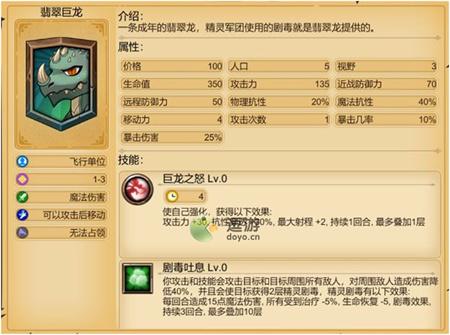 1.翡翠巨龙拥有剧毒吐息技能:攻击带毒,且AOE,溅射伤害是中心伤害的60%。但是,翡翠巨龙也是没有主动攻击技能的。它的技能效果为不消耗攻击次数的1回合自身强化。除开这个强化技能,它自身就只有精灵地形被动的增伤。它并不是以伤害见长的英雄。