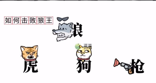 1、第六关【如何击败狼王】有一只狗、一只猫、一把枪、一个狼王,首先把【王】字拖动到【猫】字处