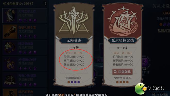 7.4金的套装是“瓦尔哈拉试炼”,除了和“无限英杰套装”一样提供了基础属性,还提供了其他的额外效果,每提升一级可以增加150战力,抗性魂石的选择和之前说的一样,但是这种搭配还存在一种变种,就是打上红色魂石。