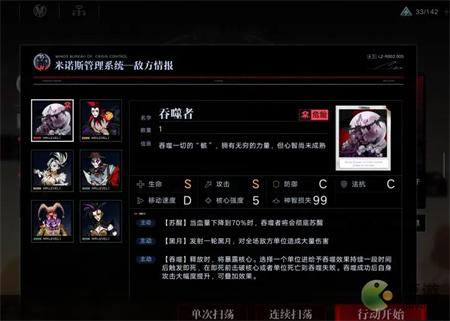 技能:吞噬者一阶段a前方一排的一个敌人若干下再aoe,注意前期放庇护,一阶段只会漏一次核心数量为3;二阶段为a两下再aoe然后露出核心数量为2以此循环。
