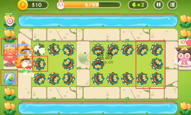 7.第七波,左边中间加一个花塔,右边中间加三个魔法球。