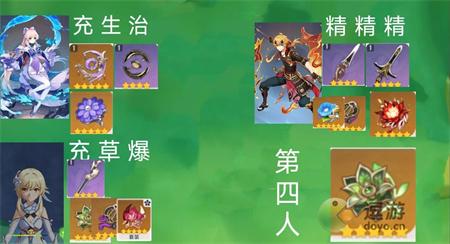 4.第四人:无论是谁,统一推荐四草套。(草主有了四就没必要)最好是武器还能来个西风。但请先弄清楚这个角色的定位,不同定位有不同就业空间。如我的科莱就是纯粹为了补循环和上buff的角色,就可以无脑四草暴击头充能沙西风弓。统一推荐四草是因为,反应的精通已经是溢出的状态了,而草四件套的减草抗效果,特别容易触发。无论你变个谁都能触发草四件套,所以优先推荐