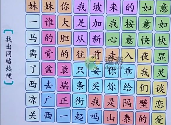 1、找出网络热梗6依次是:一马离了西凉关、如意如意按我心意快快显灵、入夜我们谈恋爱、去广西一起吗、我是从新加坡来的、妹妹你大胆的往前走、谁的骨盆最端正、只要你乖给你买条街、我是隔壁的泰山