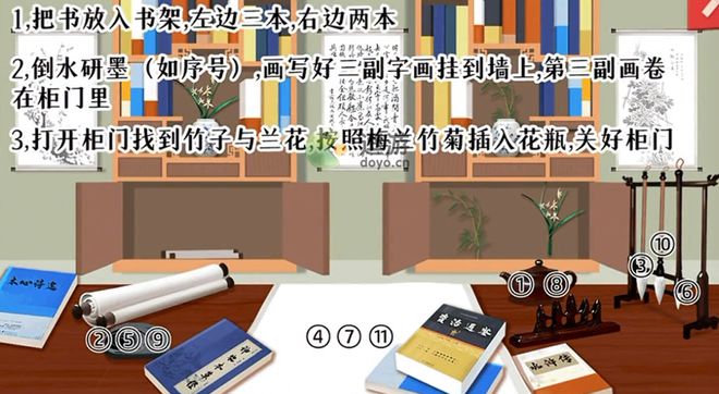 1、【文房四宝】关卡需要整理书房,首先将散落的书放进书柜,左边三本,右边两本