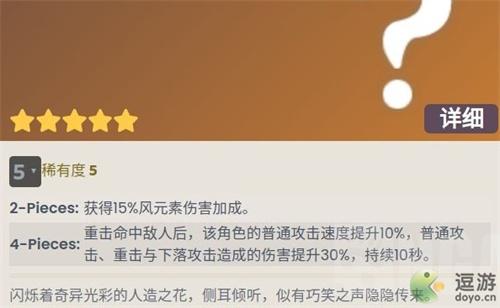 装备角色的Bloom、Hyperbloom、Burgeon反应伤害提升50%。 此外,当装备角色触发 Bloom、Hyperbloom 或 Burgeon 时,他们将额外获得 25% 的上述效果加成。 每个堆栈持续 10 秒。 最多同时堆叠 4 个。 该效果每秒只能触发一次。 装备它的角色不在场时仍然可以触发它的效果。