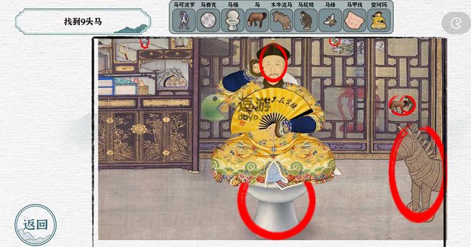 1、【找到9头马】分别是:木牛流马、马、马屁精、马赛克、马桶、皇阿玛、马可波罗、马甲线、马蜂