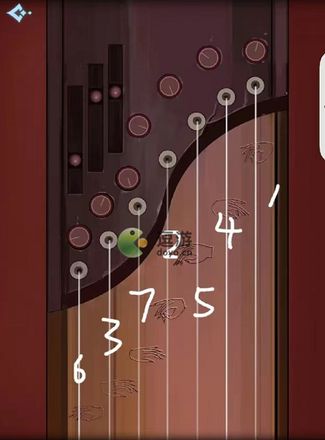 3、进入右边场景,完成桌子上旗子游戏,获得提示,打开柜子,获得【旋钮】,把旋钮按在古琴上,完成调音。依据右边场景架子上琴谱顺序演奏。