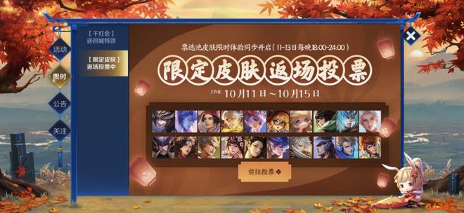 在活动的这段期间内,最终在10月16日,票数获得最多的两位皮肤,将在周年庆期间进行返场。