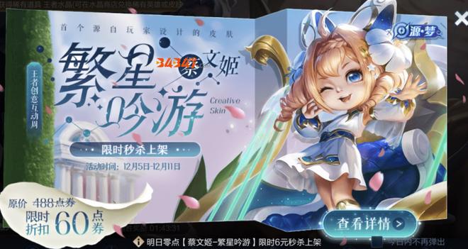 在2019年12月5日的00:00时,峡谷就将迎来蔡文姬限定皮肤“繁星吟游”的上线。这款皮肤原价是488点券的,上新价限时仅60点券。说实话,这个皮肤这个价格入手绝对值。