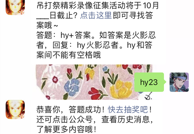 在火影忍者手游" title="火影忍者手游">火影忍者手游10月22日的每日一题:吊打祭精彩录像征集活动将于10月___日截止?< a href="https://mp.weixin.qq.com/s/4FpE2psdmW3Q1Qw49Pv0GA">点击这里</ a>即可寻找答案哦~答题:hy+答案。如答案是火影忍者,回复:hy火影忍者。hy和答案间不能有空格哦。下面小编就为大家带来了火影忍者手游10.22每日一题答案,一起来看看吧。
