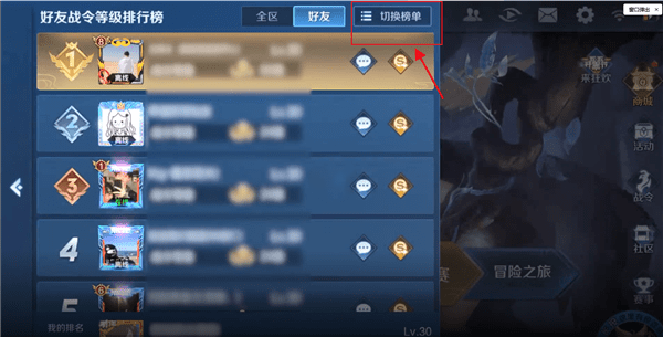 2、进入好友战令等级排行榜,点击正上方的【切换榜单】;