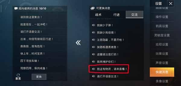 2、打开快捷消息页面,选择添加【我这有物资,请来查看!】;